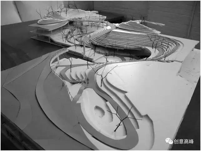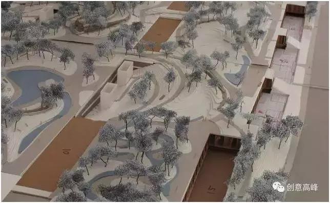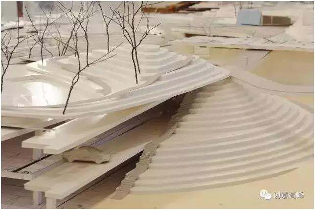 由此高差布局的水景,也成了山地景觀中的自然瀑布水景。層次豐富、錯落有致的高差關系,由于從根本上徹底改變了原有場地平直、呆板的空間,哪怕我們即使用最簡單的模型來表現(xiàn),山地峽谷自然景觀都已顯得極為真切!