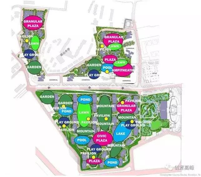 珠海前山新城,由美國風景園林設計師Christopher L.Counts主持設計,建造面積55英畝,坐落于兩層停車場之上。設計者采用了大膽的地形起伏,極大的豐富了住宅區(qū)的公園式體驗。